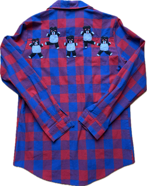 Cat Singh of Nebraska is the artist behind this bear shirt. She calls him "Rooster Eyed Rob" after a stuffed animal she won at a local fair.