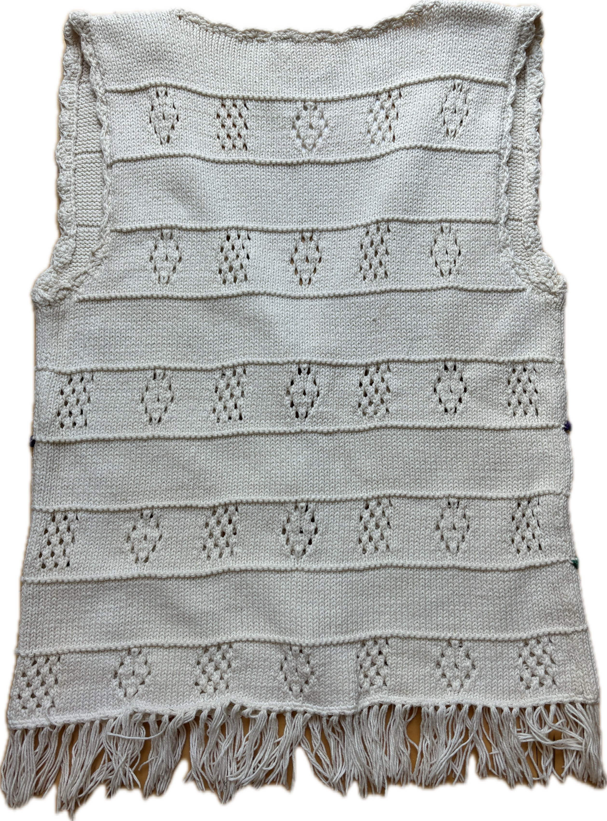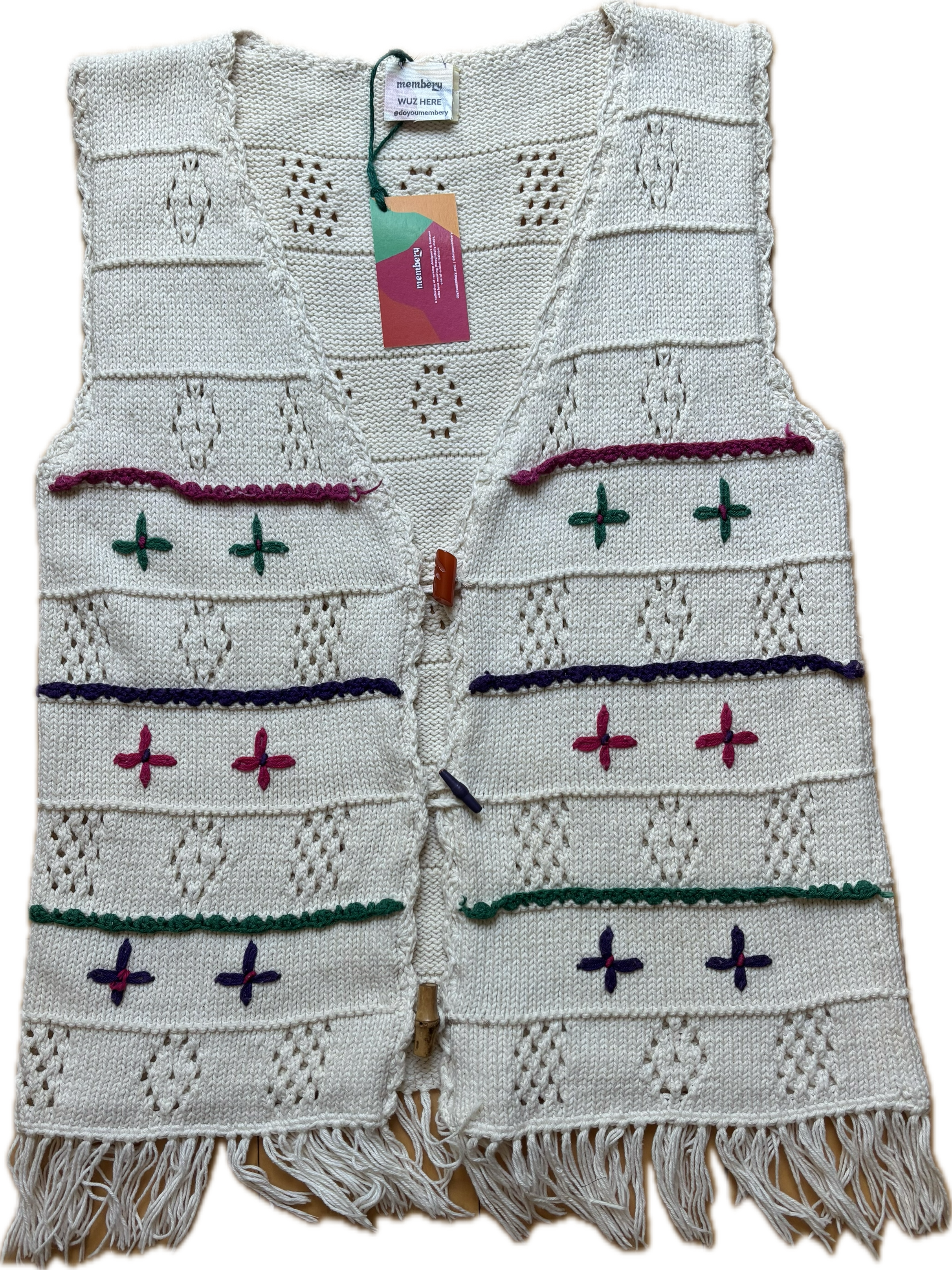 A 100% cotton vest was missing buttons, so I added some toggle vintage buttons. It's a lightweight cotton with sweet fringe at the bottom.