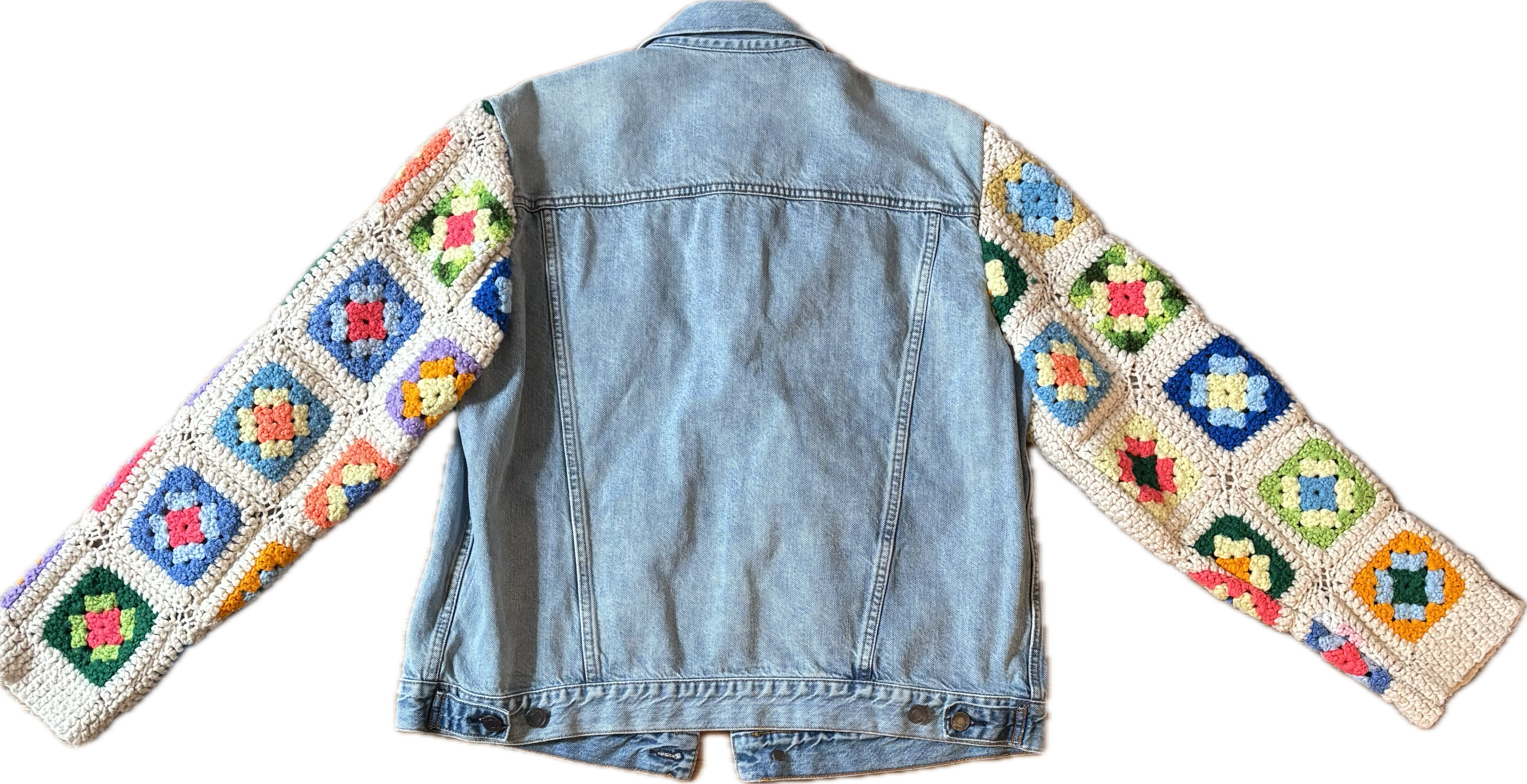 This Membery original strips the sleeves off a Gap denim jacket and replaces them with a white grandma square crochet blanket. Then the sleeve cuffs get added back on. Don't worry, we don't throw anything away! The denim gets reused for patches and other projects. Can you find something cuter than this one-of-a-kind piece?